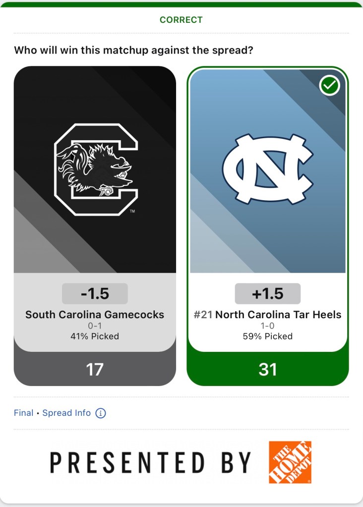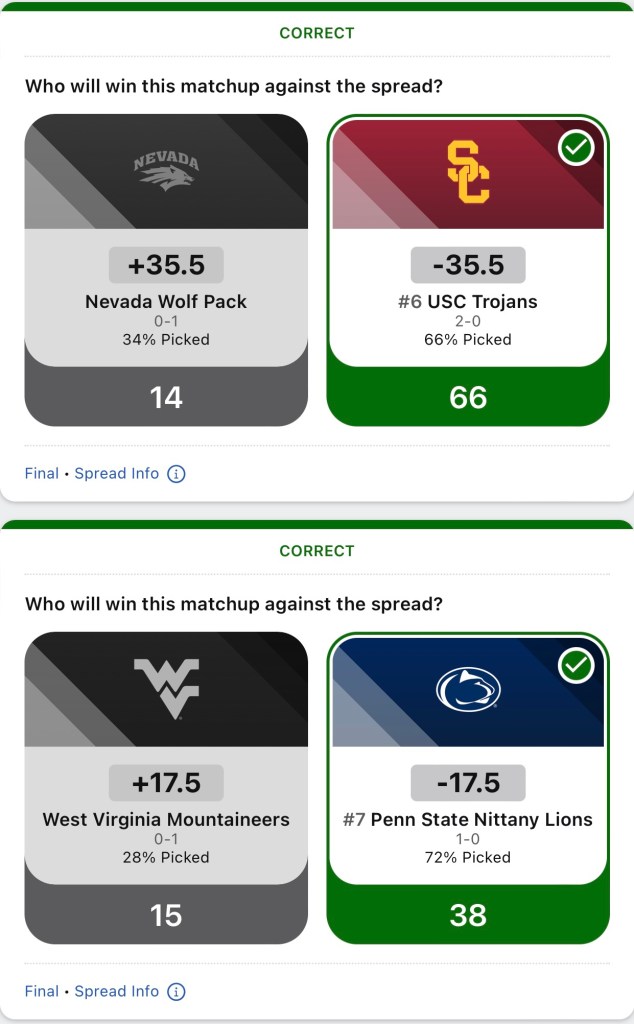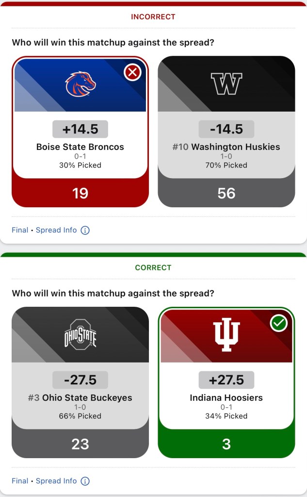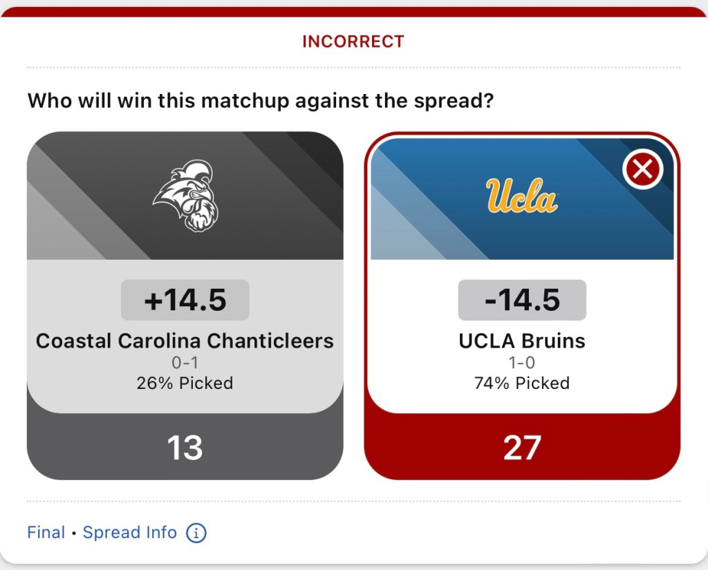 I’m going to start my College Football spread pick’em posts back up. I was late posting week 1. So I’m just posting my picks that I made. All future picks will be posted before the games are played. I started off pretty good with a 6-4 record after week 1.
