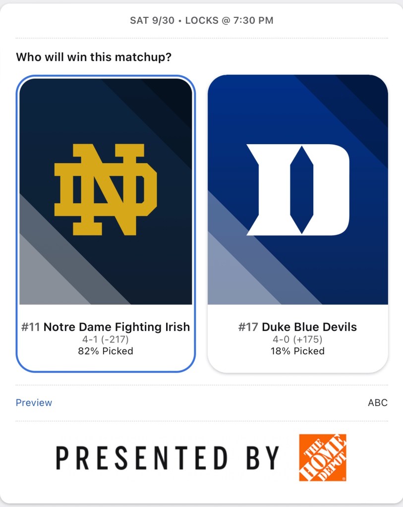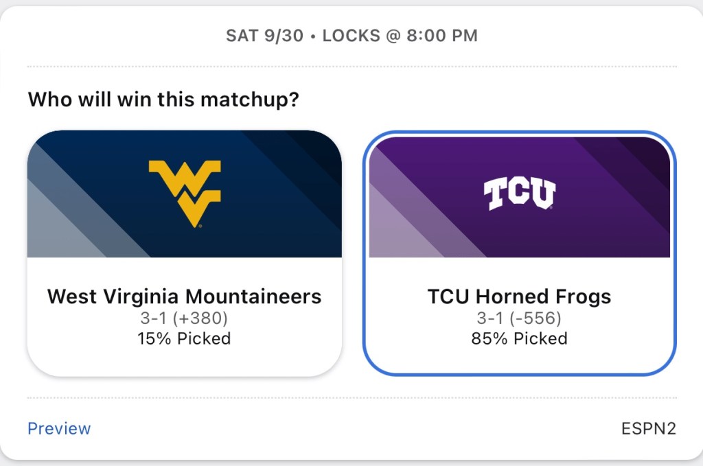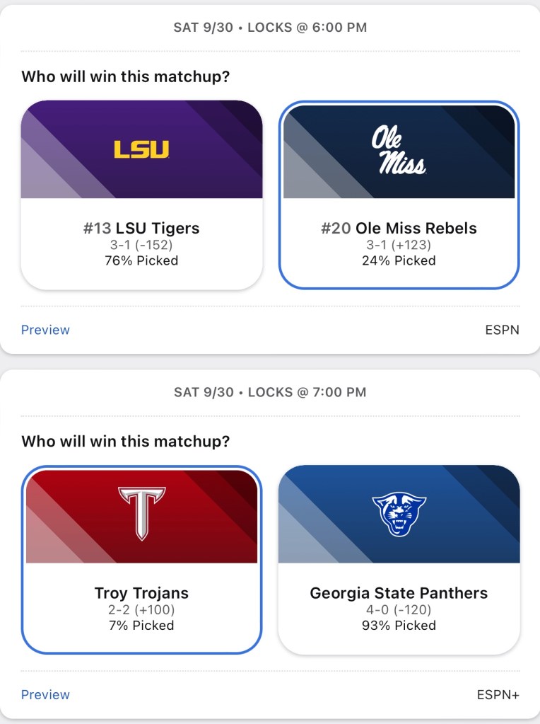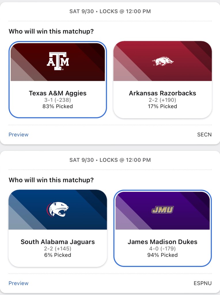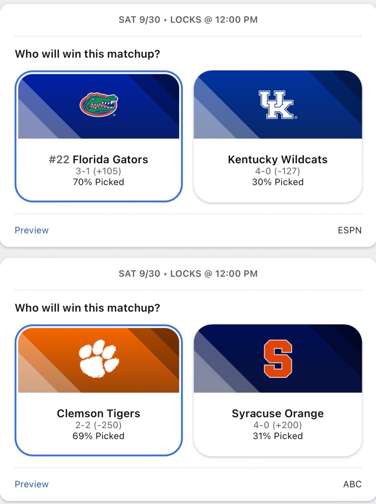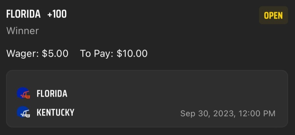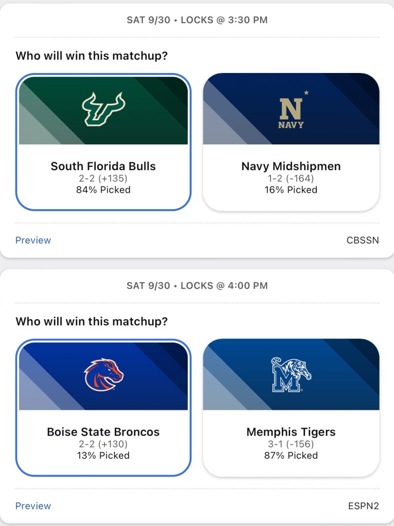 It seems very odd for Kentucky to be favored against Florida. The Gator’s only loss this year was week 1 vs Utah and they had a big win vs Tennessee in week 3. UK is a basketball school and hasn’t played anyone this year, so yeah, I’m taking the Gators moneyline in this one. Clemson lost in OT to FSU last week, and Syracuse also hasn’t played anyone. Dabo gets his team back on track with a two score win against an ACC opponent.Arkansas is on a two game losing streak following losses to BYU and LSU. A&M just beat Auburn by 17. I’m taking the Aggies. I’m not even sure where James Madison is located, but I know jaguars don’t live in south Alabama, so give me the Dukes.South Florida played Alabama pretty tough in week 3 and they just put up 42 points on Rice. Navy is still running that stupid triple option and if USF can hold their own against Alabama’s Oline and RBs then they should be able to take care of Navy. Boise State is on a two game win streak and Memphis only beat Navy by 4 points, I’m taking the Broncos.Ole Miss couldn’t upset Alabama, but only lost by 14. If Ole Miss had beaten Alabama they’d be a top 10 team, and we all know how well Brian Kelly does against top 10 teams. Regardless, the Rebels will beat the Tigers. Georgia State hasn’t played anyone this year, Troy isn’t very good, but I’m still taking the Trojans.The Irish better beat Duke or they need to fire Freeman and go get Urban Meyer. But they won’t, because Notre Dame isn’t about winning championships anymore.Since losing to Colorado in week 1, TCU has gotten back on track. West Virginia is only averaging 18.5 points per game over their last two games, that’s not good enough to beat the Horned Frogs at home.