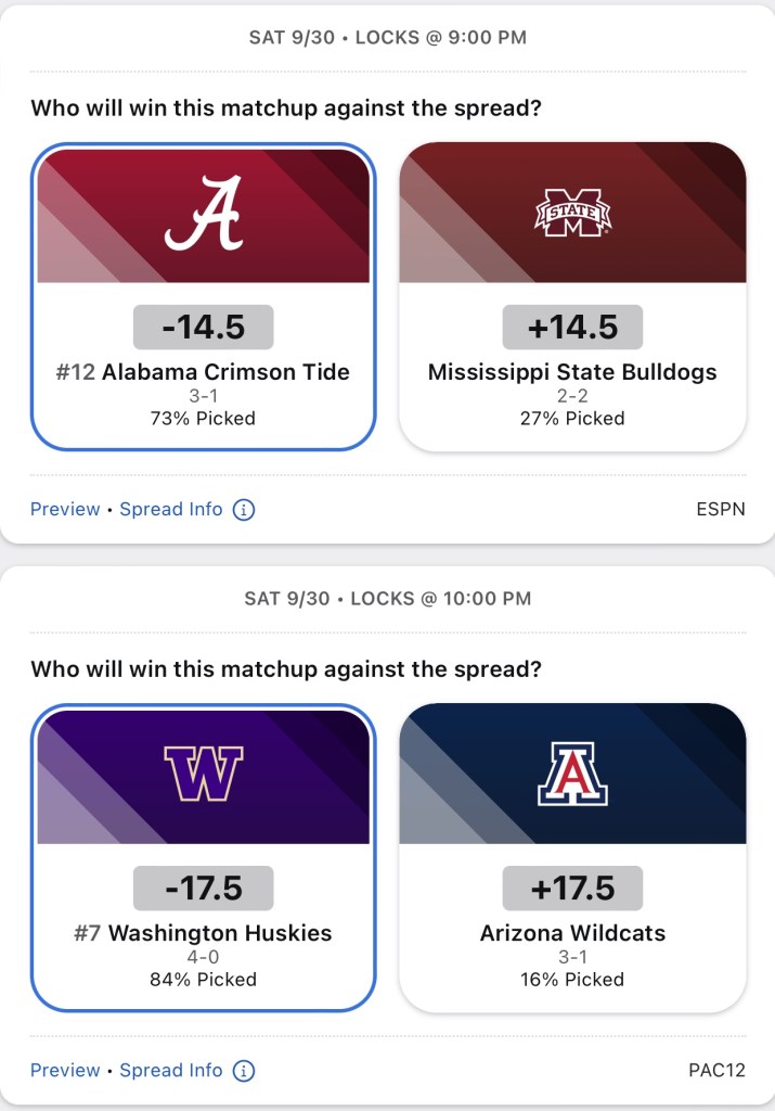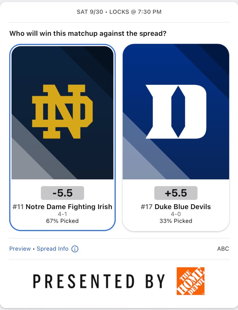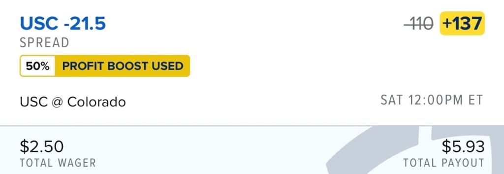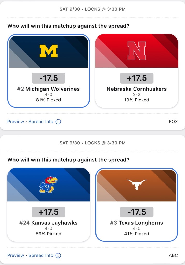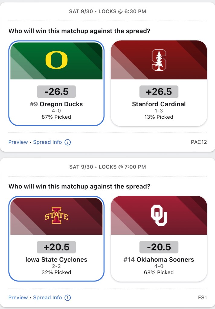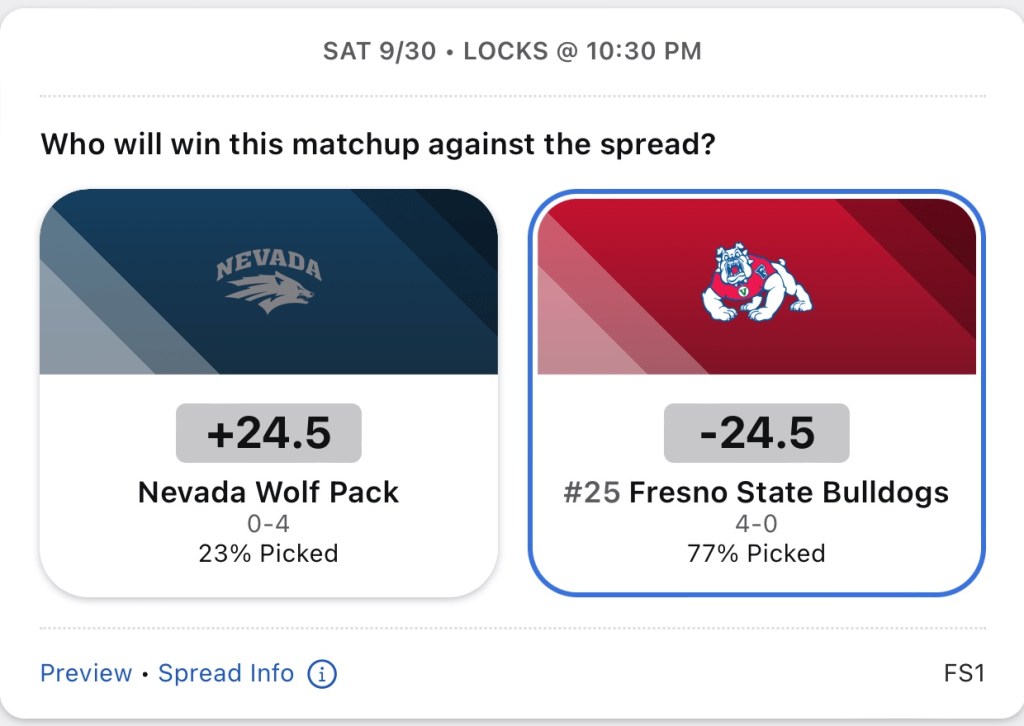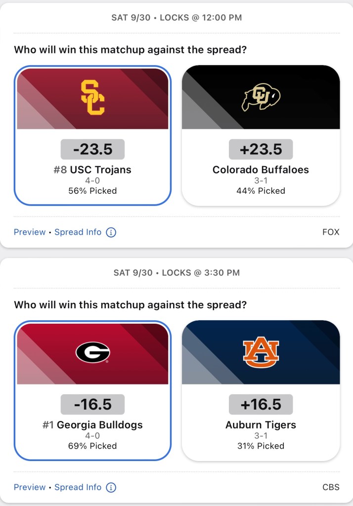 Colorado just got blown out by Oregon 42-6, USC’s offense is a lot better than Oregon’s. Unfortunately for Deon, it’s gonna be another long day. Auburn just lost by 17 to Texas A&M, give me the Dawgs -16.5 all day.Michigan so far has beaten everyone they’ve played by at least 24 points this year. Nebraska got beat pretty bad by Colorado 36-14 earlier this year, and they only beat Louisiana Tech by 14 last week. Michigan wins by 30. I will never buy what Kansas Football is selling, but at least they temporarily made the top 25 this year. Texas wins by at least 20 points in this one. Texas already proved to be legit this year after beating Alabama by 10 in Tuscaloosa.27 points is a lot, but Stanford is really bad this year, they lost to Sacramento State for crying out loud. Oregon wins by 40. Iowa State is always one of those BIG12 teams that can pull off an upset. I don’t see them beating Oklahoma, but I think it’s a close game.You know I honestly do not care about this game at all and I will not watch it. All Notre Dame had to do last week was give Estime the damn ball and run out the clock. They’ll probably crush Duke, but as far as I’m concerned, screw the Irish. Gerad Parker is a loser. And how do you not know you only have 10 men on the field, TWICE?!?Alabama is a weird football team to watch this year, but Mississippi State is an SEC bottom dweller. Bama cruises past the Bulldogs by 30 and the media darlings probably move up in the rankings next week. I’m honestly surprised the Washington vs Arizona game isn’t a bigger spread. Arizona only beat Stanford by a point and lost to Mississippi State. The Huskies win in a blow out.I haven’t watched Fresno State or Nevada this year. But, Nevada lost to Idaho 33-6, which is 27 points. So Fresno State should at least cover.