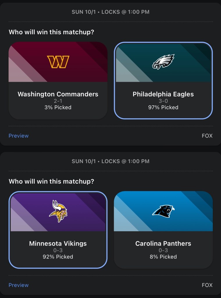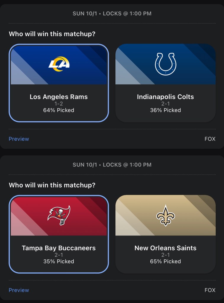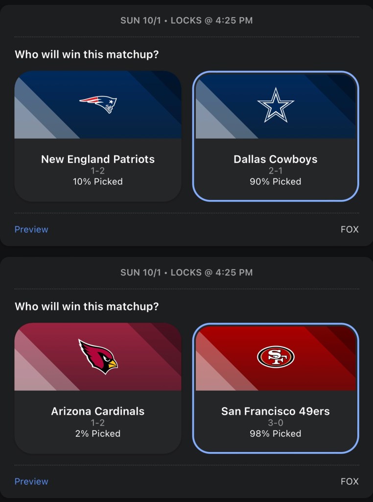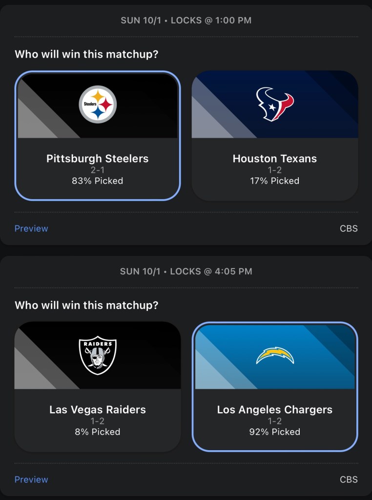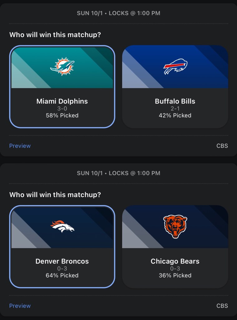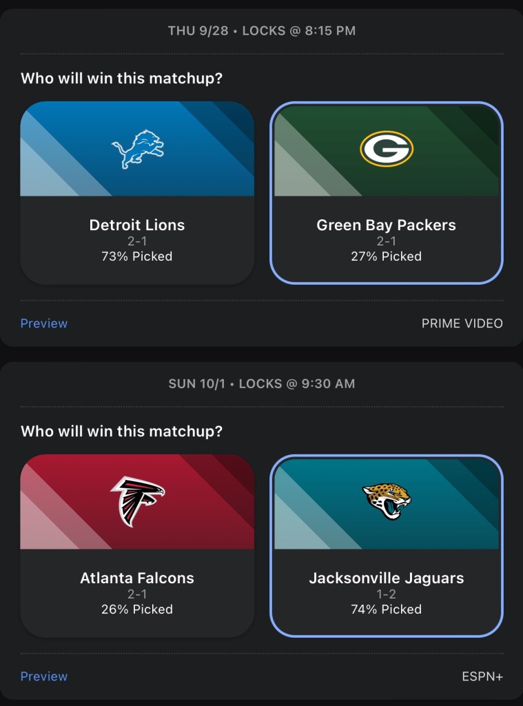 I really hope the Packers didn’t get lucky for a third time and get another HOF QB to make it 3 in a row. But, it sure does seem like Jordan Love is legit. Detroit is still Detroit, I’m taking the Packers in a low scoring Thursday Night game. I’m predicting a huge game from Trevor Lawrence and Calvin Ridley. Jaguars’ offense and defense both play lights out and they crush the Falcons.I’m going with the Dolphins against the Bills, because they just scored 70 on the Broncos, which is also why I’m going with the Broncos over the Bears, because they just had 70 points dropped on their heads. The Dolphins keep rolling and beat the Bills. The Broncos got embarrassed so they play mad and beat the BearsBoth Browns and Ravens are scraping the bottom of the barrel for RBs, so I’m picking based on who’s the better QB. I like Lamar Jackson more than Deshaun Watson in this one. It’s time for the Bengals to get in a grove, they finally got the monkey off their back Monday night when they beat the Rams and I think they build on that win with another win against the Titans.This Colts team is playing way better than I thought they would and their future looks bright, but they have too many missing pieces on that team right now and their luck begins to run out against the Rams. The Saints will be without Derek Carr for quite sometime and in his place is Jameis Winston, and he sucks.The Eagles are my Super Bowl pick this year and also my pick to stay undefeated the longest. The Commanders will get blown out in this one. The Vikings get their first win of the season, their offense is just way better than the Panthers.Who would have thought the Steelers would have started the season 3-1, especially with no run game? Chargers win in another shootout vs the Raiders.I like the Cowboys over the Patriots, but I think it’s a close game. Cardinals somehow won last week, but they don’t get lucky again vs a pretty good 49ers team.The chiefs get fat after easily beating the Bears last week and have to fight at the end to win this game. The Giants flat out suck this year. If Daniel Jones continues to not be able to pass the ball, I could see them tank for Caleb Williams.