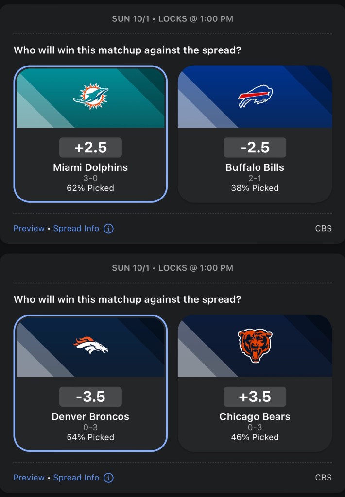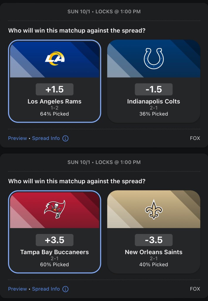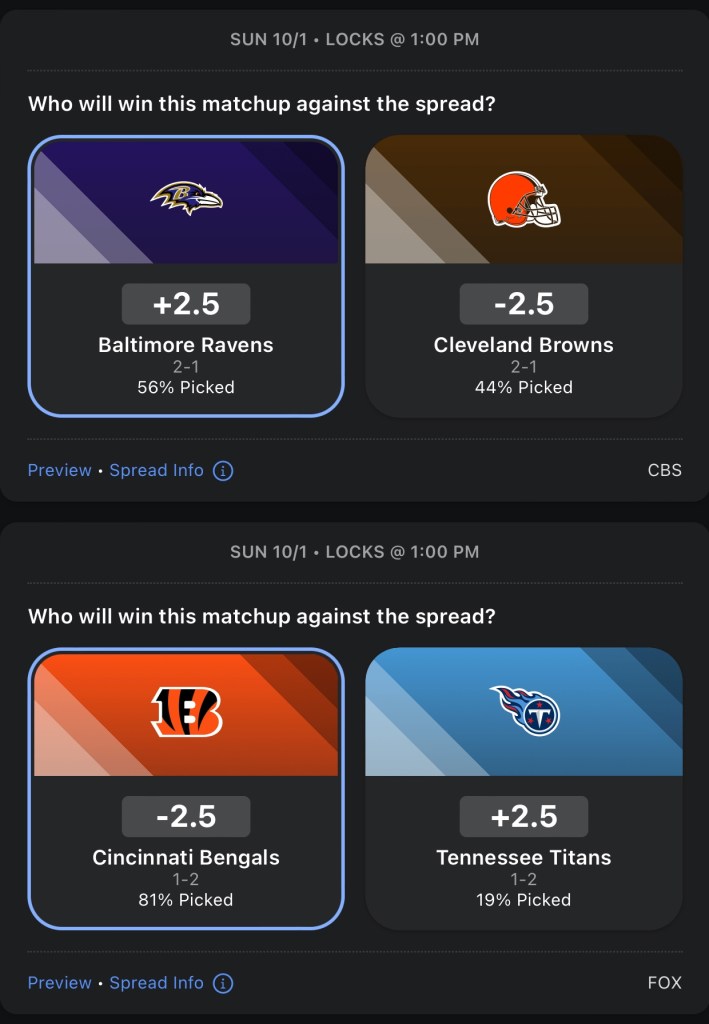 My NFL week 4 spread pick’ems. These spread picks are pretty tough, I went 7-9 last week for a season record of 21-27. The spreads for this week’s games are so close that you’re basically picking the winner for all but 3 games. If you want to see why I picked each winner check out my moneyline pick’ems post.