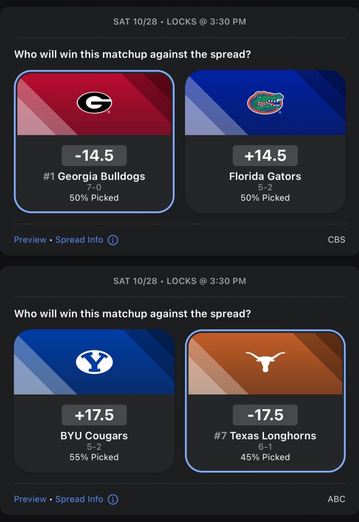 Way better last week, I went 6-4. Here are my week 9 College Football Spread Pick’ems. My season record so far is 45-35.