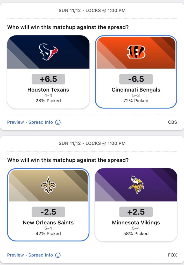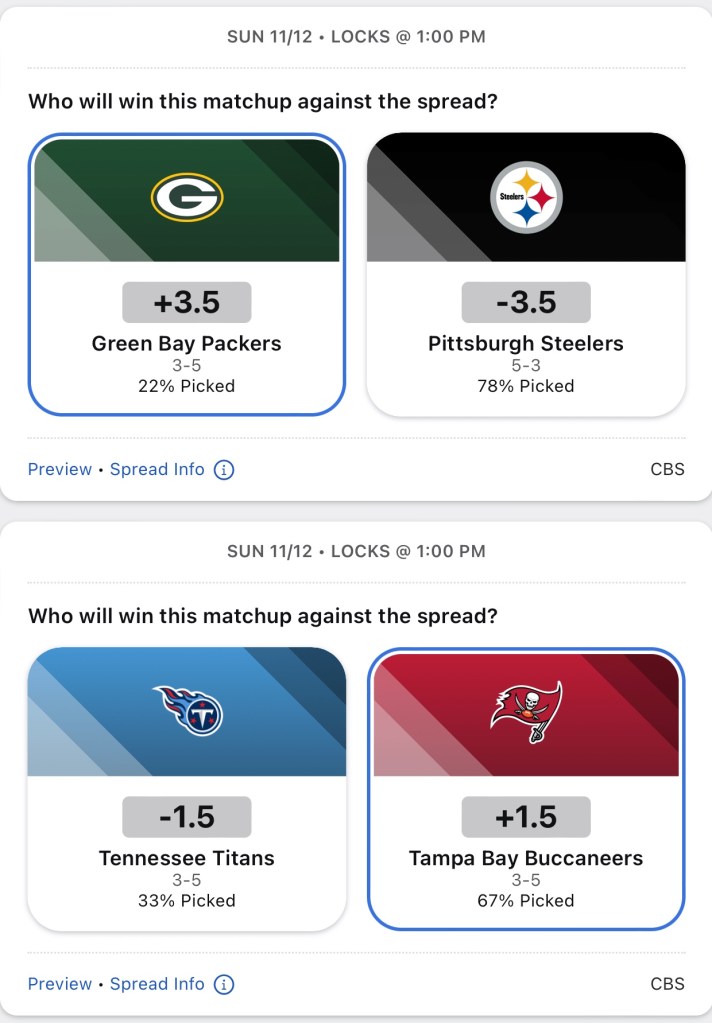 Last week I went 10-4, bringing my season record to 69-67. I finally broke .500. Here are my week 10 spread pick’ems.