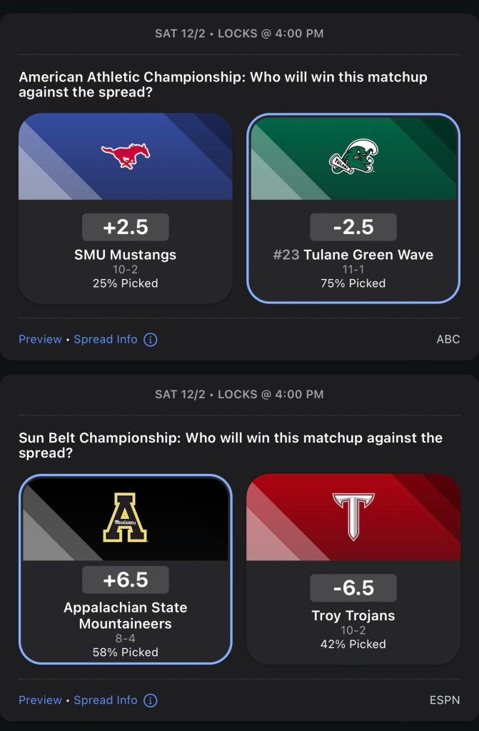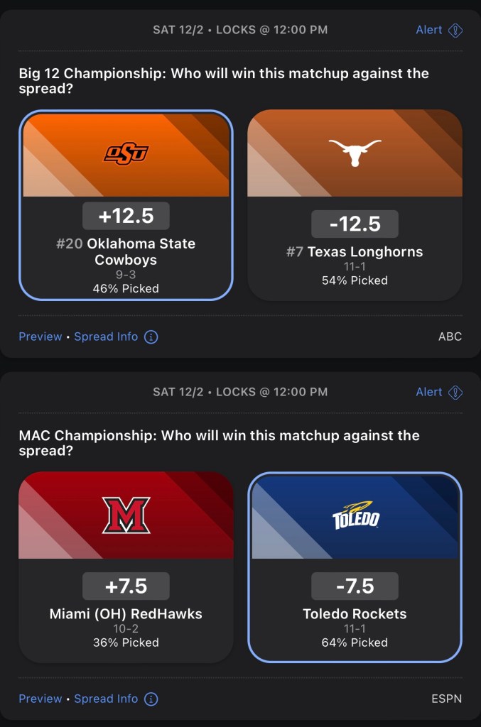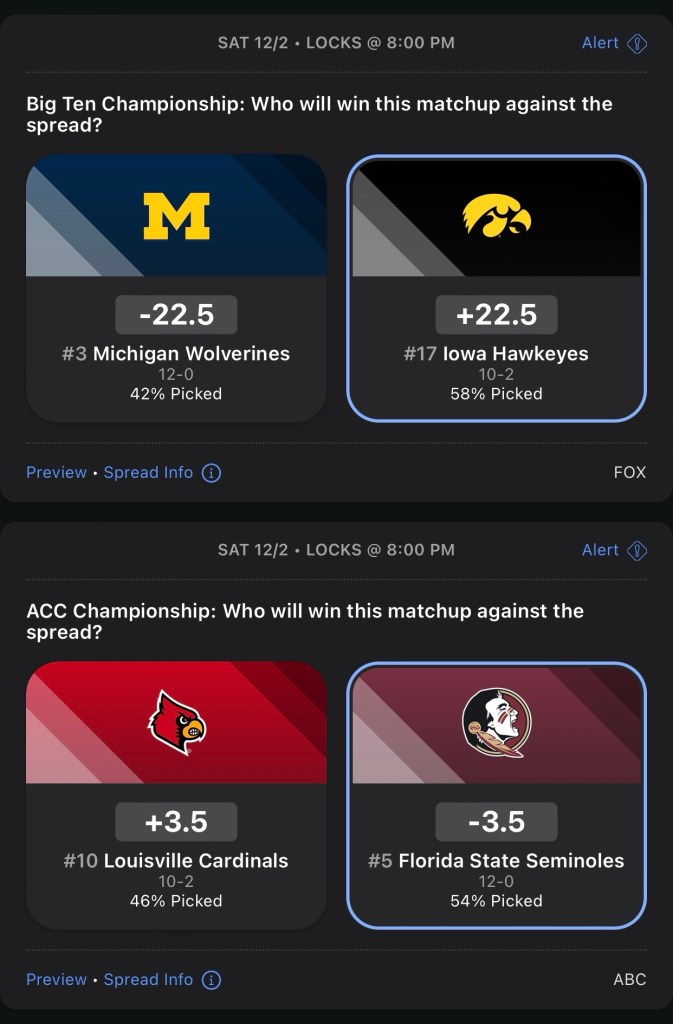 College Football Week 14 Spread Pick’ems Posted byNateNovember 30, 2023November 27, 2023Posted inCollege Football Pick’emsTags:College Bets, College Football, College Pick’ems, Football, Gambling, NCAA Football, NCAA Football 2023, Pick’ems, Pigskin Pick’ems, Spread, week 14 I went 5-5 last week. Here are my week 14 College Football Spread Pick’ems. My season record so far is 77-53. My Bets This Week TBA Season Record: 77-53 Share this: Click to share on X (Opens in new window) X Click to share on Facebook (Opens in new window) Facebook Like Loading...